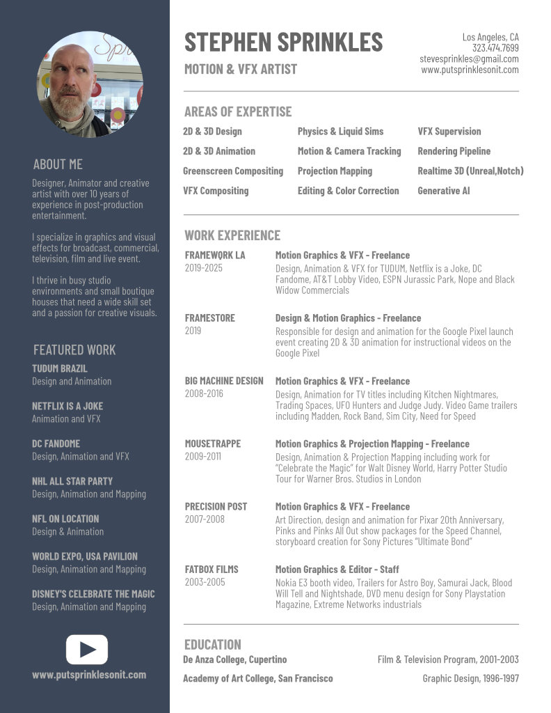 I have a passion for the work and the process of creating entertainment in web, broadcast and live event shows focusing on Motion Graphics, Design and VFX.